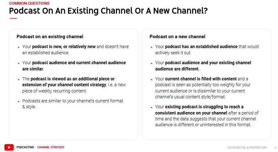 Anstatt Podcastern universelle Anweisungen zu geben, listet YouTube an vielen Stellen eher Argumente auf. Diese können sich auch durchaus mal widersprechen, da nicht für alle Nutzer dieselben Maßnahmen sinnvoll sind. So kann es für unbekannte YouTuber Sinn ergeben, ihren Podcast auf dem Hauptkanal hochzuladen, während sich für bereits erfolgreiche Podcaster auch ein separater Kanal anbieten könnte.